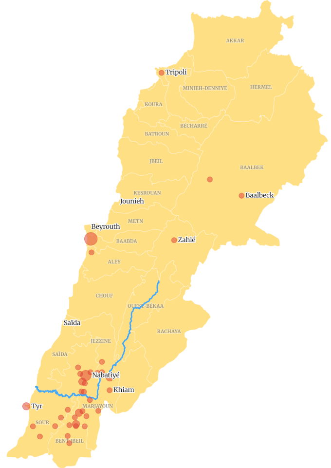 des zones frappées au Liban par Israel vs zones contrôlées